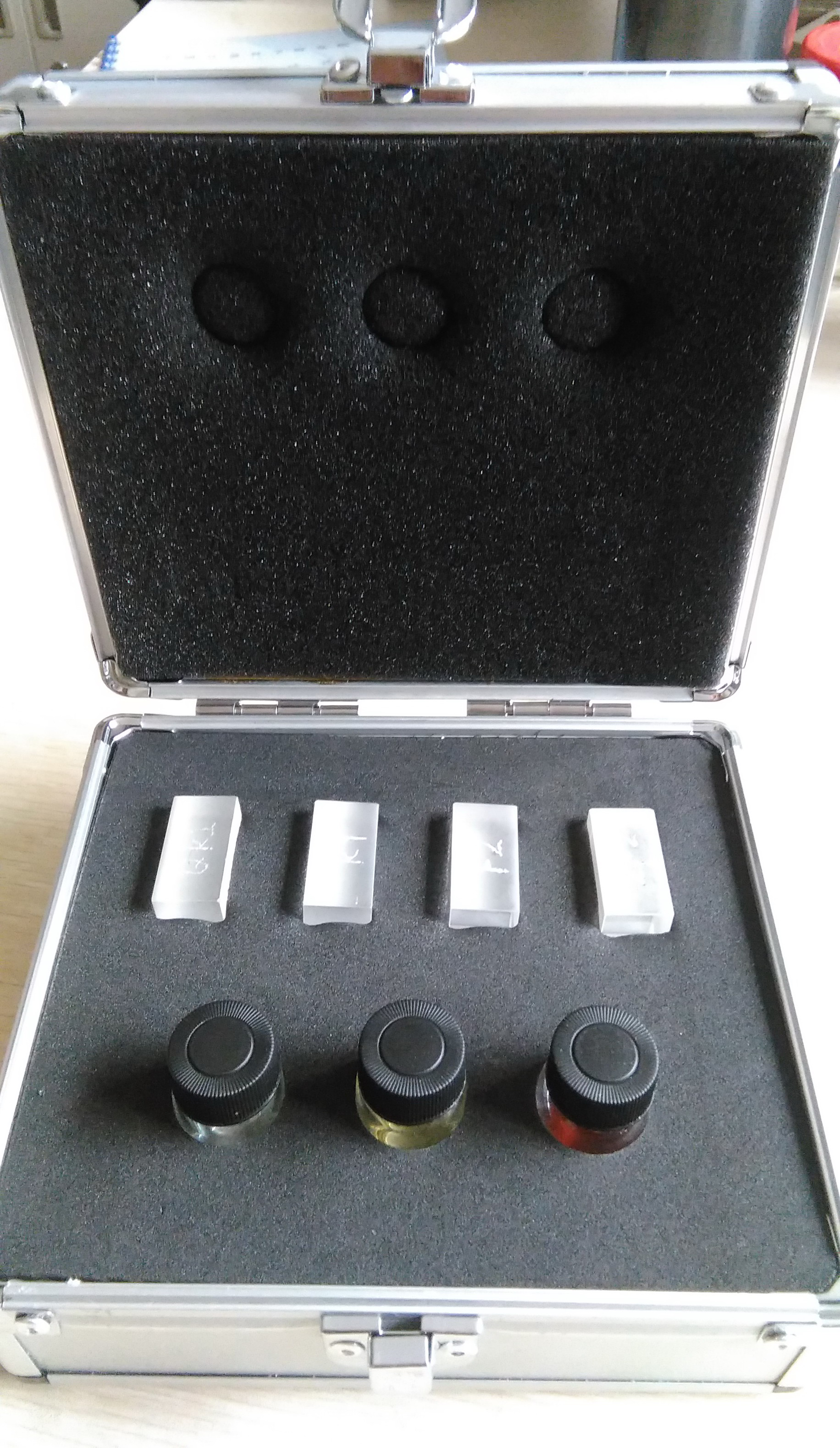 阿貝折射儀是利用全反射臨界角原理,測量透明、半透明液體或固體的折射率(nD)和平均色散(nF-nC)的儀器。 GG-AB型阿貝折射儀檢定裝置,用于檢定阿貝折射儀或其它利用阿貝折射原理的計量儀器。 一、組成 阿貝折射儀檢定裝置由四種阿貝折射儀標(biāo)準(zhǔn)塊,三種折射液組成。 四種阿貝折射儀標(biāo)準(zhǔn)塊均為長方形塊,分別由輕冕玻璃QK1,冕玻璃K9,火石玻璃F2,重火石玻璃ZF2四種優(yōu)質(zhì)光學(xué)玻璃材料加工制成。 三種折射液分別為:水楊酸甲酯、溴代萘混合液、二碘甲烷混合液。